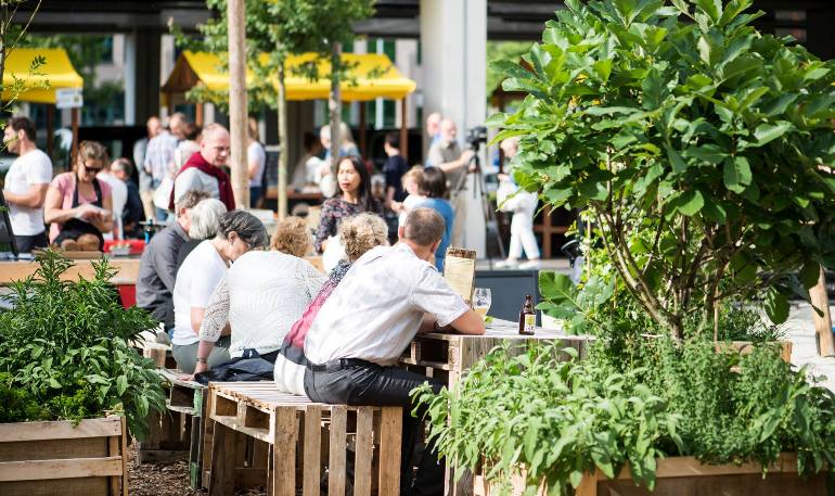 Op het binnenplein van het stadhuis in Genk, waar een pop-uptuin is ingericht.