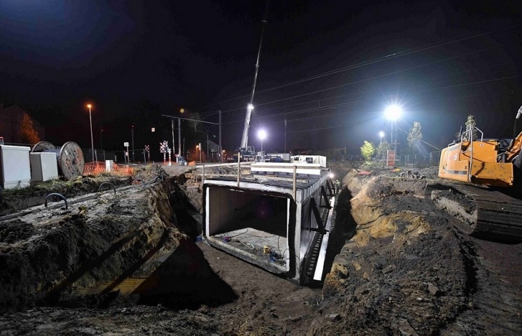 De plaatsing van de tunnel in de Hefveldstraat is zaterdagavond perfect verlopen en enkele uren vroeger dan gepland gestart omdat de werkzaamheden voor lagen op schema. Minutieus wordt de 600 ton zware tunnel op zijn juiste plaats geschoven met behulp van een speciale schuifinstallatie. De toekomstige fiets- en voetgangerstunnel is 25m lang, 5m breed en 3m hoog