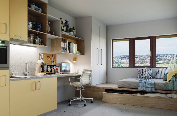 Met een bovengrondse vloeroppervlakte van 6200 m² omvat het hotel met gemeenschappelijke keukens en leefruimtes, ondergebracht in een toren met een hoogte van 41,5 meter.