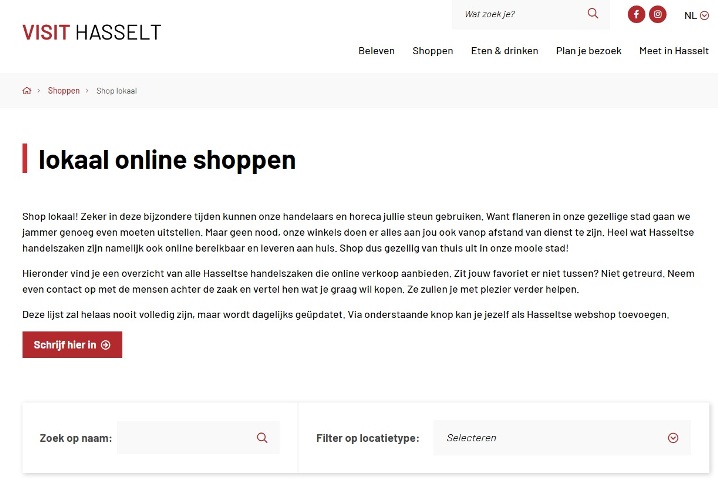 "Als stadsbestuur vinden we het belangrijk om ook ons steentje bij te dragen. Om het lokaal online shoppen in Hasselt te promoten en te stimuleren hebben we een pagina gemaakt waar onze Hasseltse handelaars die online bereikbaar zijn worden getoond. Uiteraard is de volksgezondheid op dit moment prioriteit nummer één. Maar we willen de mensen bewust maken van het belang van het voortbestaan van een sterke lokale handel en horeca. Een stad zonder handel en horeca is een dode stad. Hierbij een warme oproep om je favoriete lokale handelaar te steunen."